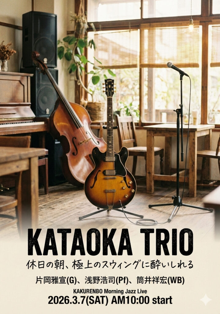 2026年2月19日 / 最終更新日時 : 2026年2月19日 Bleyasa3271 Studio 303 3/7(土) AM10:00〜 岐阜市長良「かくれんぼ」モーニングライブに出演します。 2026年3月8日(土)、岐阜市長良の「かくれんぼ」にて、ドラムレスのギタートリオユニット「KATAOKA TRIO」のライブ決定! ぜひ、聴きにいらしてください。 共有: クリックして X で共有 (新しいウィンドウで開きます) X いいね:いいね 読み込み中… 関連 コメントを残すコメントをキャンセル