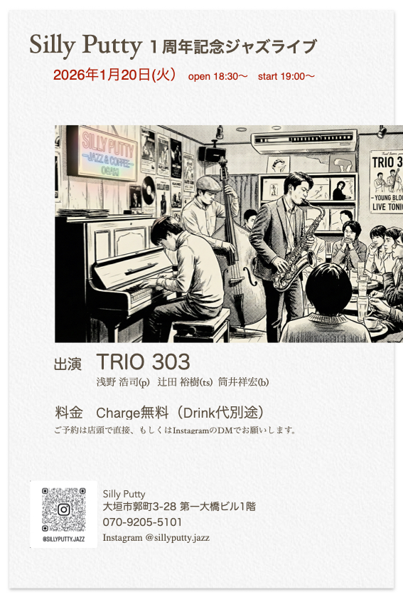 2026年1月20日夜、大垣市のジャズ喫茶「Silly Putty」がオープンして1年目を迎えます。記念ライブにStudio 303発ジャズトリオ「TRIO 303」が出演します。チャージ無料(ドリンク代別途)ですのでぜひ聴きにいらしてください。